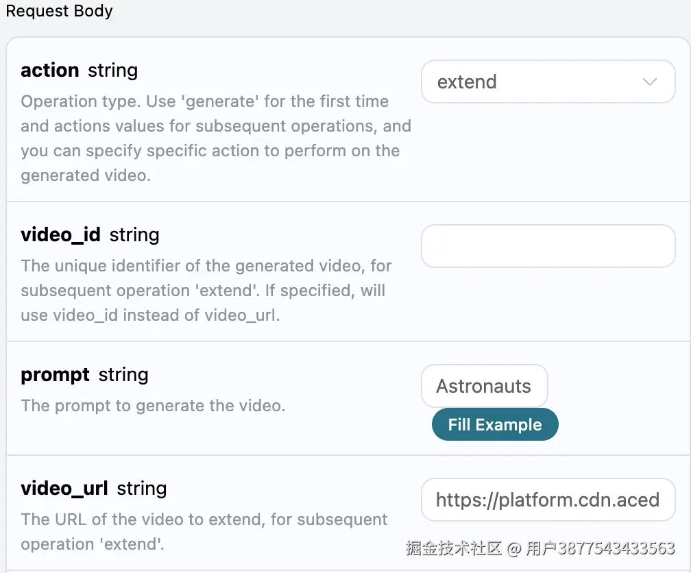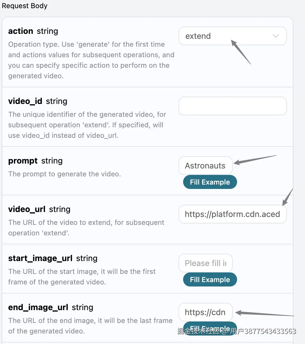 如果想对生成的视频进行继续生成的话,可以将参数 action 设置为 extend ,并且输入需要继续生成视频的ID或者视频链接,视频ID和视频链接的获取是根据基本使用来获取,如下图所示: