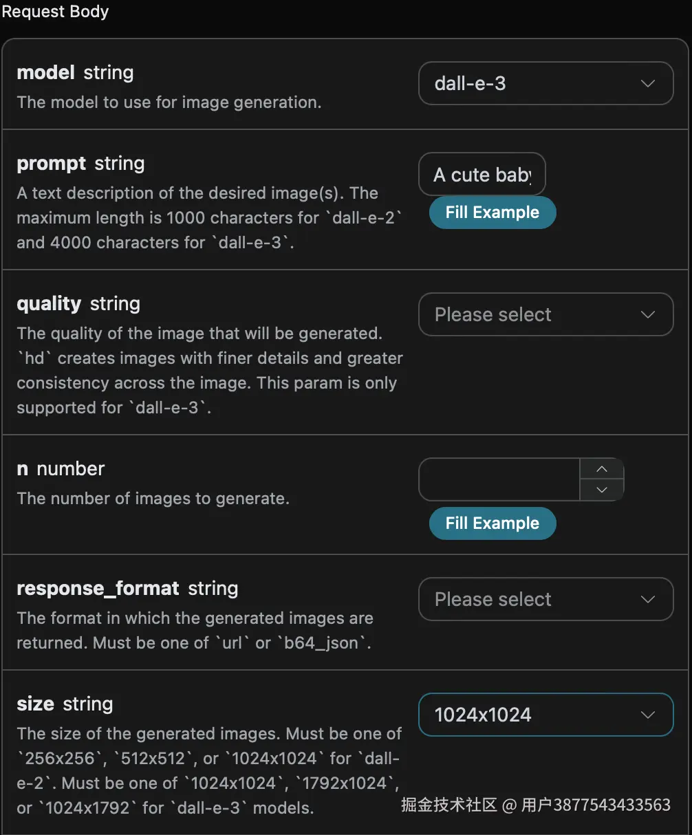 在第一次使用该接口时,我们至少需要填写三个内容,一个是 authorization,直接在下拉列表里面选择即可。另一个参数是 model, model 就是我们选择使用 OpenAI DALL-E 官网模型类别,这里我们主要有 1 种模型,详情可以看我们提供的模型。最后一个参数是prompt,prompt 是我们输入要生成图像的提示词。