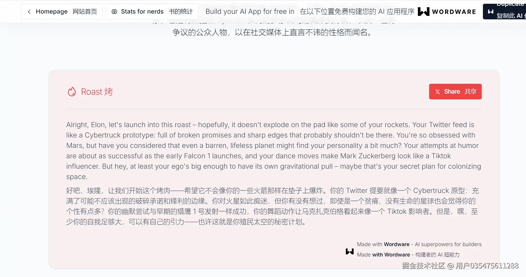 Wordware是一个低代码开发平台,允许任何人构建复杂的AI Agent和APP。而毒舌AI则是基于Wordware平台构建的一个应用,其主要功能是分析推特用户的公开历史发言,并给出犀利的点评。用户只需输入一个推特用户名,即可获得AI对该用户的个性化评价。