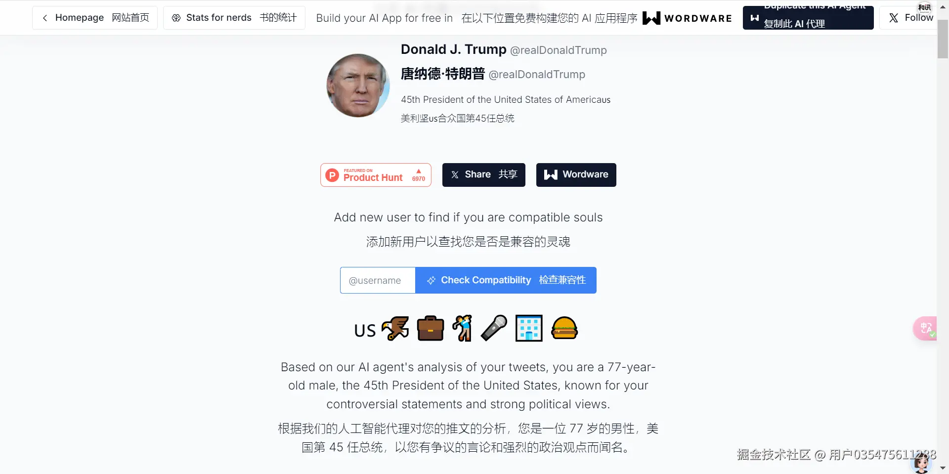 根据我们的人工智能代理对您的推文的分析,您是一位 77 岁的男性,美国第 45 任总统,以您有争议的言论和强烈的政治观点而闻名。