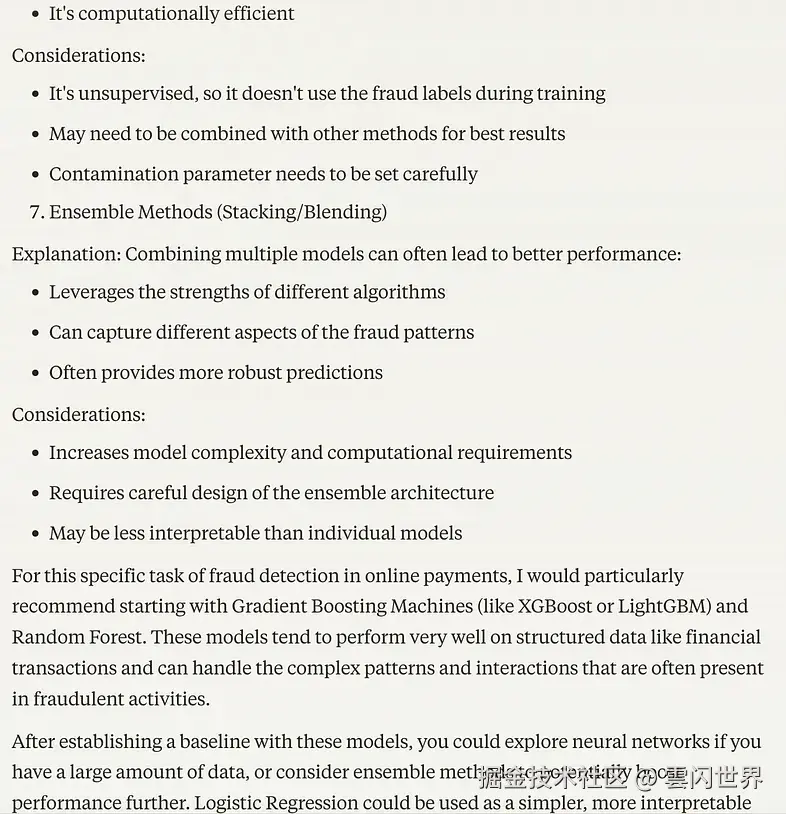 双子座进阶版 (3/3) Gemini 给出了五项模型建议,从逻辑回归到基于树的模型和神经网络。它进一步列出了不平衡数据集的四个重要考虑因素,这在欺诈检测的背景下非常重要。 我继续提问If I don’t have the isFraud column, what model will you recommend?以测试它对无监督模型的了解。它推荐了 Isolation Forest,这与 ChatGPT 和 Claude 一致。