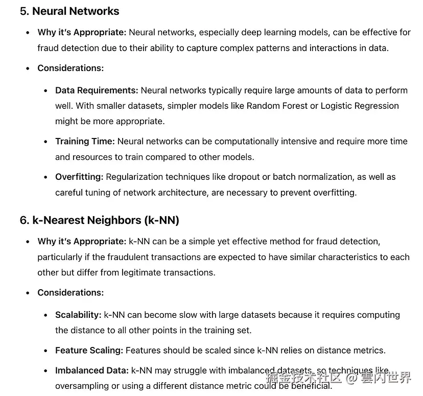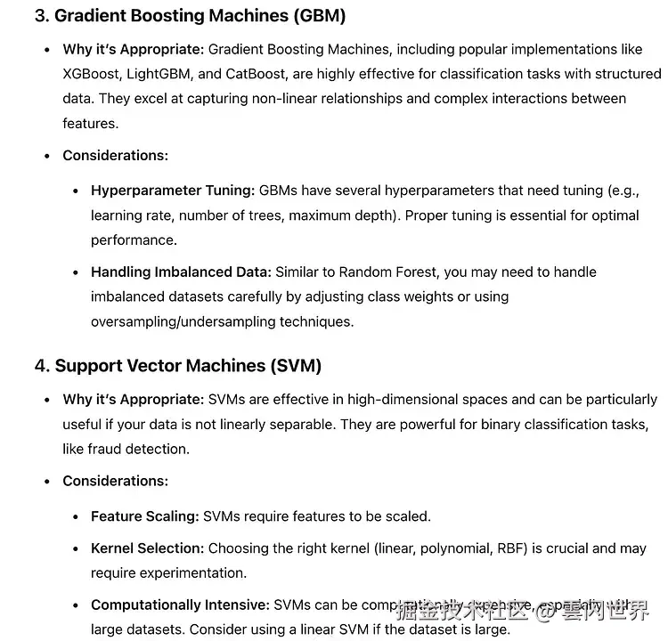 - 模型选择 接下来我让AI工具推荐最合适的模型:"Can you recommend the most suitable machine learning models for this task? For each recommended model, provide a brief explanation of why it is appropriate and mention any important considerations for using it effectively"。 聊天GPT-4o (3/3) ChatGPT 列出了八个具有明确用例和注意事项的候选模型。这几乎涵盖了所有常见的分类模型,以及用于异常检测的无监督模型(KNN 和孤立森林)。它还推荐了起点和后续步骤。 当我问它会选择什么具体模型时,它回答说,考虑到不平衡的数据集、捕捉复杂模式的能力、对特征重要性的洞察以及高效且良好的性能。这与业界的一般做法非常吻合。Gradient Boosting Machines (GBM), specifically XGBoost or LightGBM