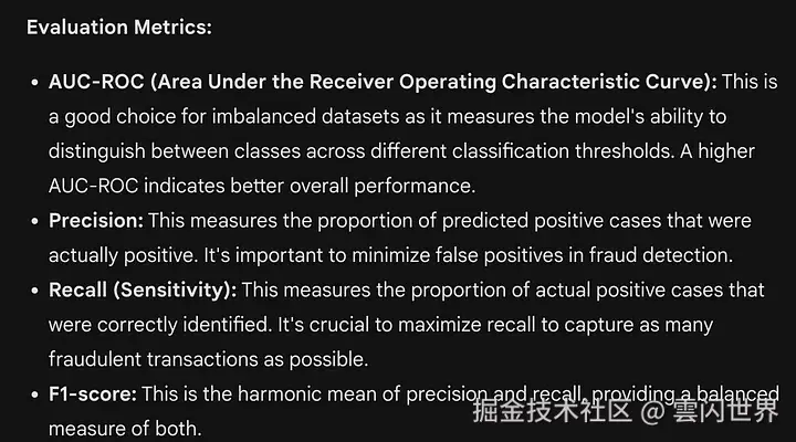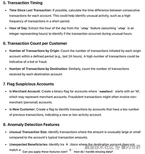 - 特征交互:ChatGPT 建议基于现有列创建余额差异、相对金额和交易时间等特征来检测交易异常。这些也是现实世界欺诈检测中常用的特征。