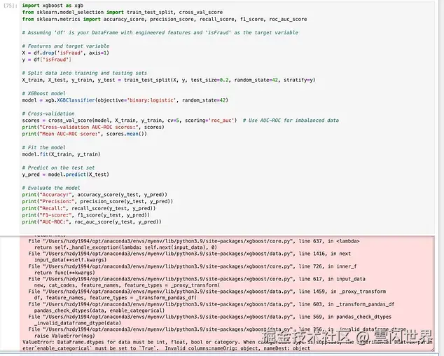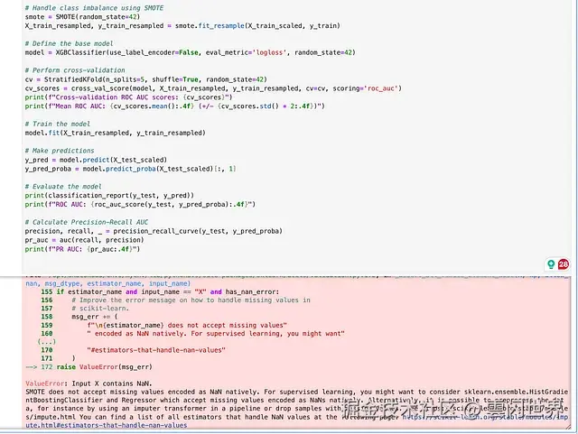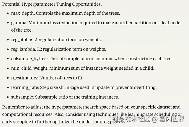 3.模型训练与评估 现在我们进入最后一轮——模型训练和评估。这是我的提示:Can you provide the code to train an XGBoost model? Please ensure that it includes steps like splitting the data into training and testing sets and performing cross-validation. Please also suggest the appropriate evaluation metrics and potential hyperparameters tunning opportunities. ChatGPT-4o(3.5/4) ChatGPT 提供了准确且结构良好的代码脚本,涵盖了从模型训练、评估和交叉验证到超参数调整的所有方面。代码成功运行,没有任何错误。它还解释了评估指标的选择,并提供了具有良好理由的超参数调整建议。 到目前为止,一切看起来都很好。但是,我仍然扣了 0.5 分,因为它没有涵盖对不平衡数据集的任何处理,例如上采样、SMOTE 或调整 XGBoost 中的相关参数(例如scale_pos_weight)。我们的数据集只有 0.2% 的真阳性率,因此在训练模型时必须考虑到这一点。这凸显了仅依赖 AI 工具进行机器学习的一个重大缺点——它们可以生成功能代码,但由于现实世界数据的复杂性,可能会忽略关键步骤,例如处理不平衡数据集。