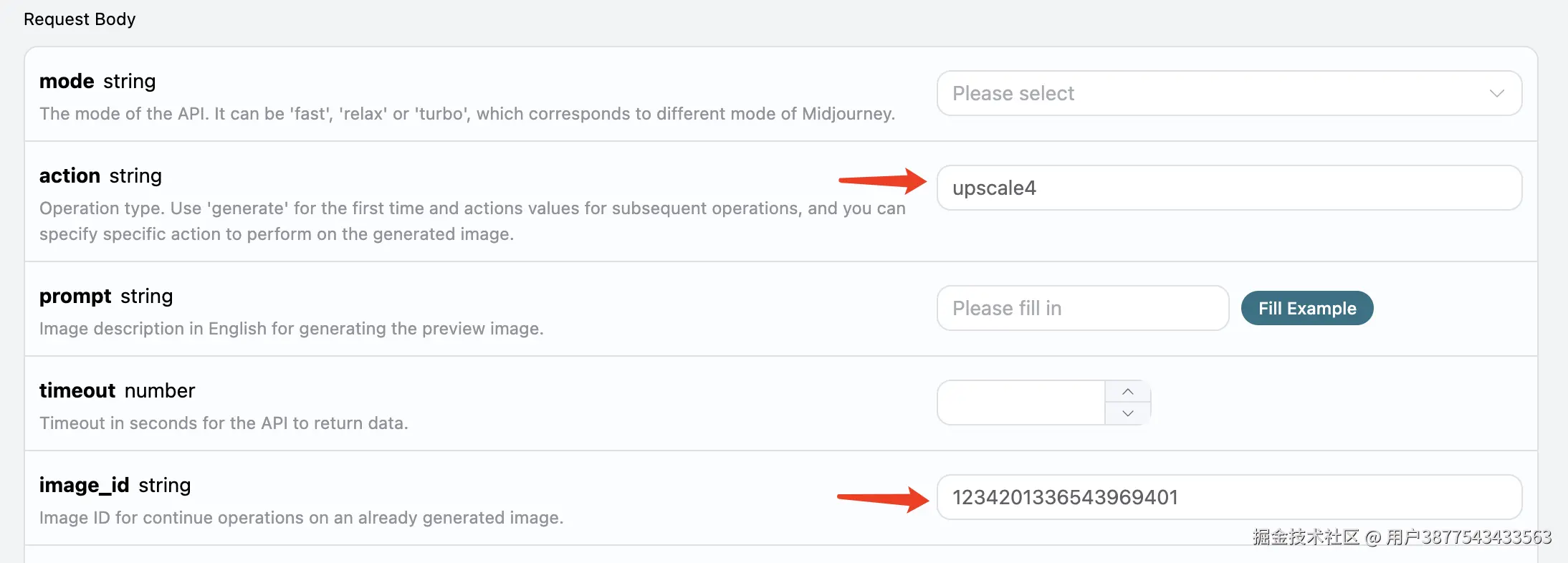 这时候我们可以挑选其中一张进行精细化地放大操作,比如选第四张,那就可以 action 传入 upscale4,通过 image_id 再次传入当前图像的 ID 即可。