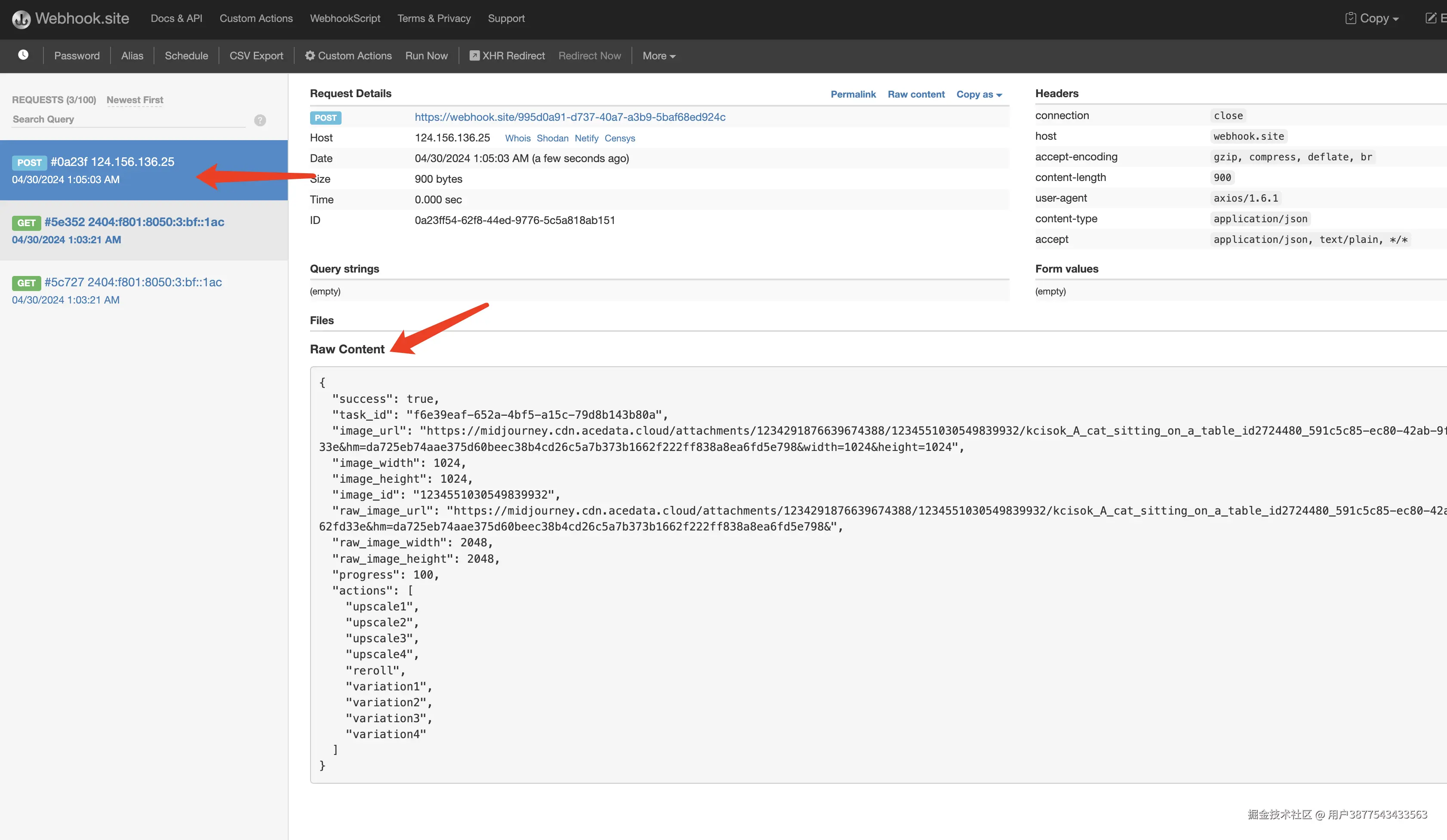 稍等片刻,等图片生成结束,可以发发现 Webhook URL 收到了一个 HTTP 请求,如图所示: