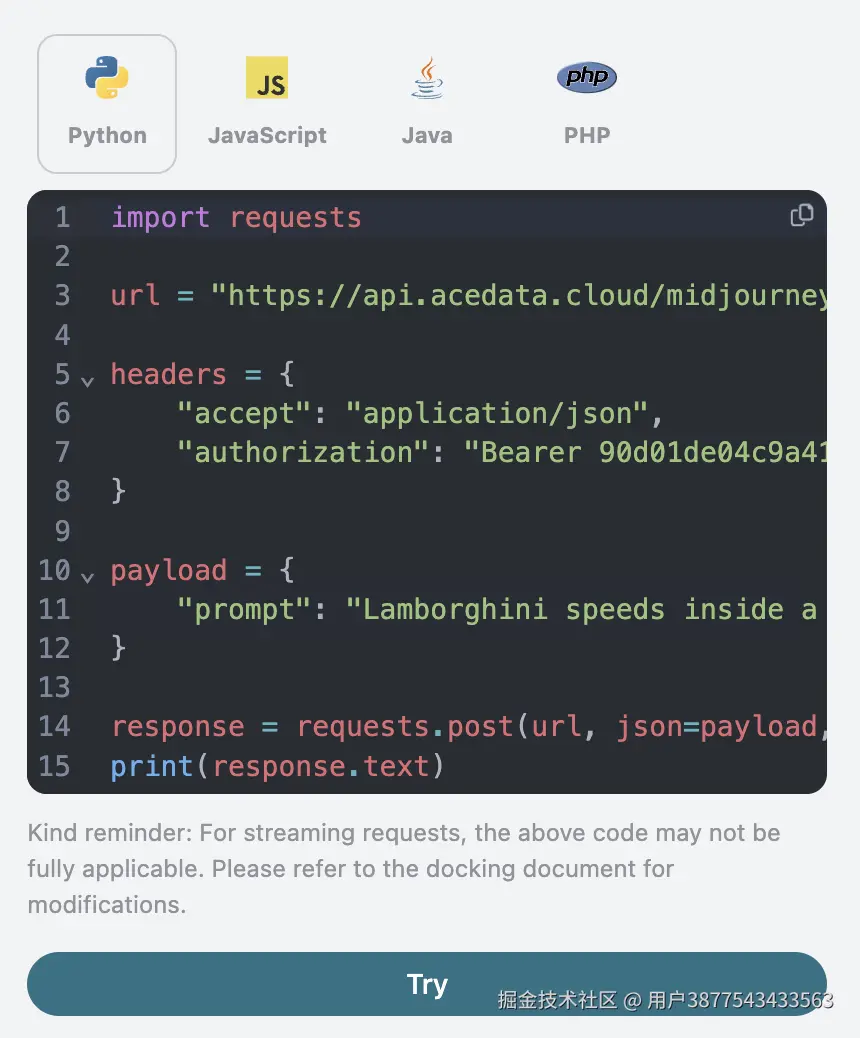 同时您可以注意到右侧有对应的调用代码生成,您可以复制代码直接运行,也可以直接点击「Try」按钮进行测试。
