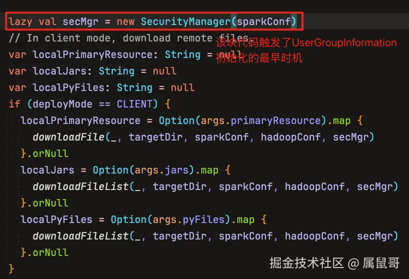最近调研了 spark-sql on yarn 时 UserGroupInformation 初始化最早时机,将 spark-sql on yarn 的整个提交流程阅读了一遍,确定了 SparkSubmit 类范围,对 SparkSubmit 进行了阅读和跟进,找出了关键的代码,如下图所示,lazy val secMgr = new SecurityManager(sparkConf),在 SecurityManager 构造方法中完成了 UserGroupInformation 初始化,该处为最早的初始化地方。