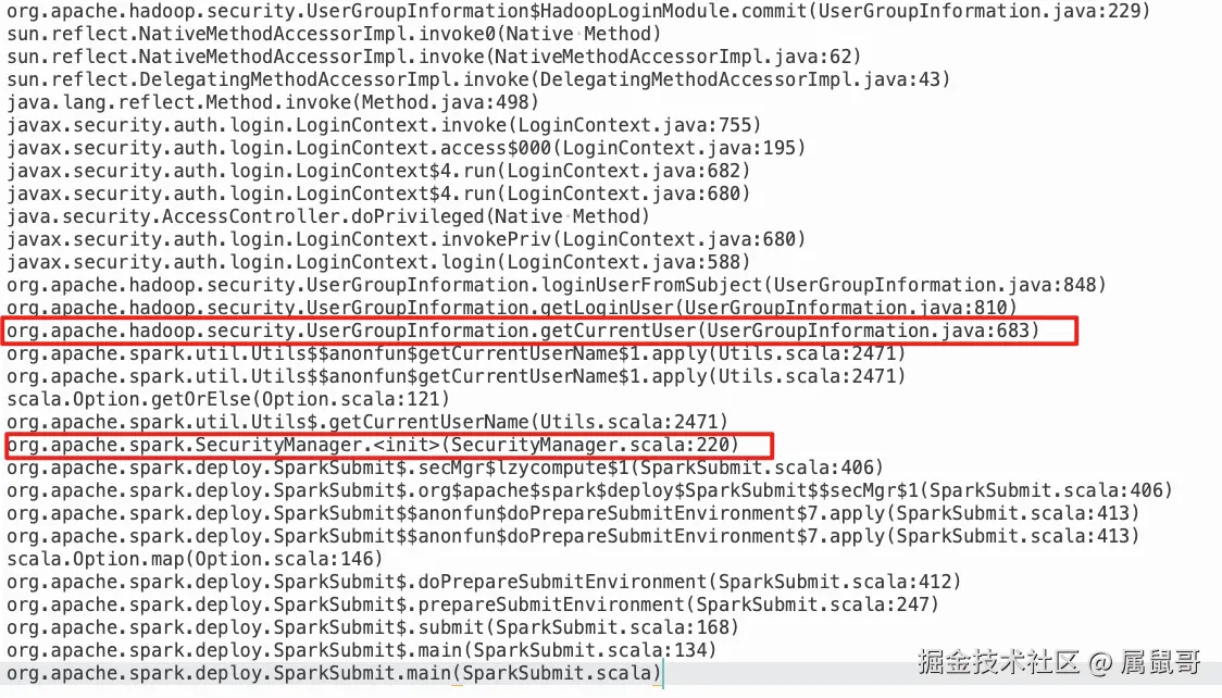 从 org.apache.spark.SecurityManager.(SecurityManager.scala:220) 构造方法往下跟进,找到 org.apache.hadoop.security.UserGroupInformation.getCurrentUser(UserGroupInformation.java:683),标识 UserGroupInformation 的初始化,此处为 UserGroupInformation 在 spark-sql on yarn 时最早的初始化时机。