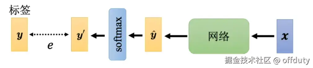 如下图所示,当我们把 x 输入到一个网络里面产生 后,通过 softmax 得到 y′,再去计算 y′ 跟 y 之间的距离 e.