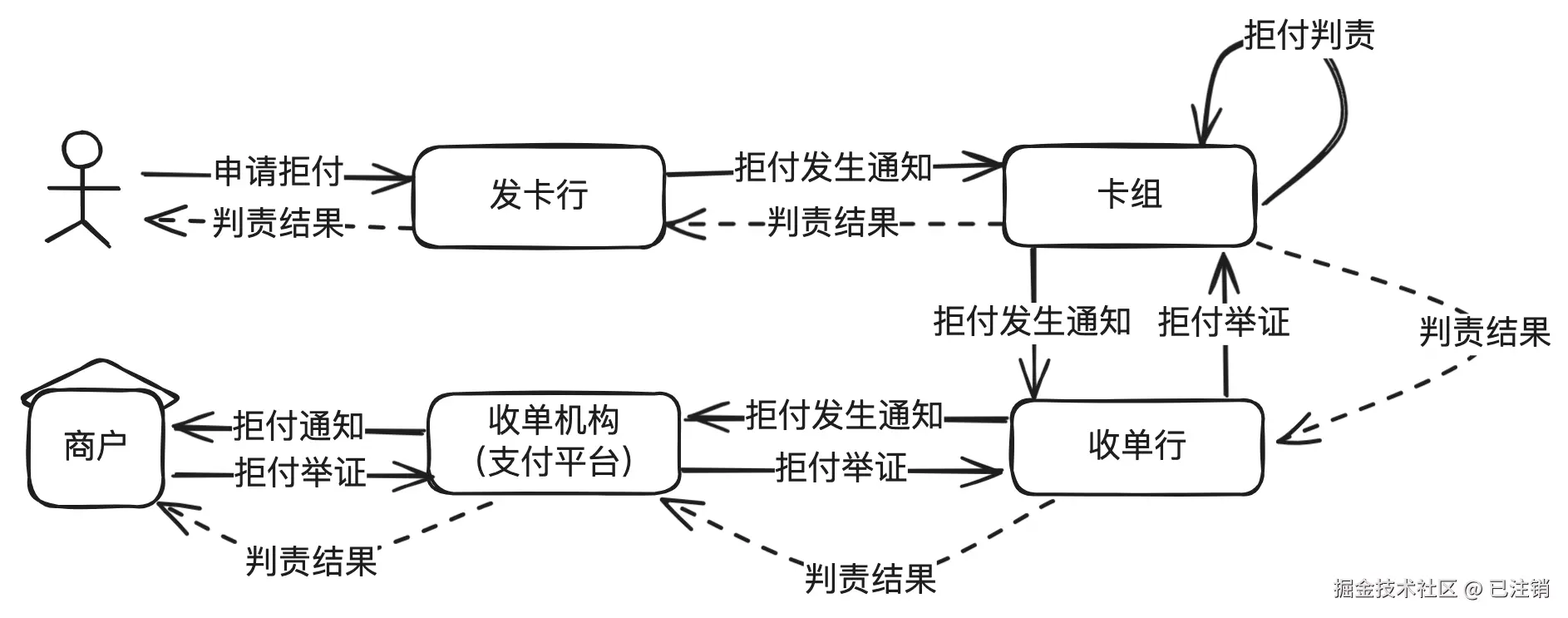 简单地说,拒付就是指用户在收到账单后,向发卡行申请对某笔交易拒绝付款。然后发卡行、卡组、收单行、第三方收单机构就开始正式进入拒付流程,中间会涉及到拒付举证、拒付判责等。