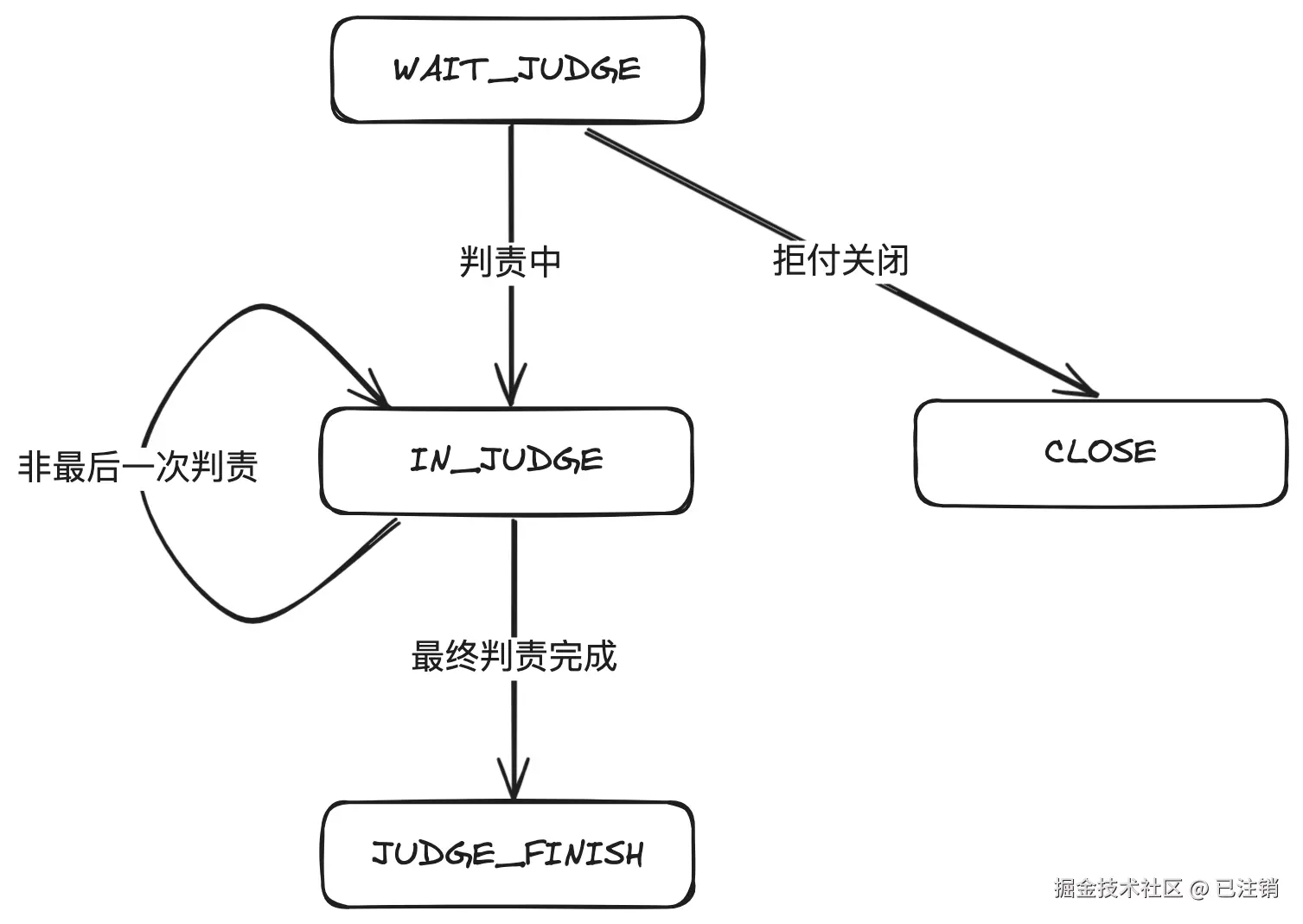拒付初始化为等待拒付(WAIT_JUDEG),可以被关闭(CLOSE),如果进入判责流程,就推进到IN_JUDGE,最后判责完成后,推进到JUDGE_FINISH。
