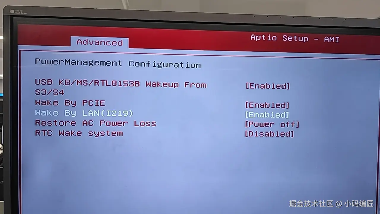 首先是有线网口要支持,比如我司大屏有俩个Lan口但只有Lan1支持远程唤醒。然后主板需要支持网络唤醒,要确认可以通过BIOS-电源管理页面查看,如下有Wake by Lan。并且是开启状态