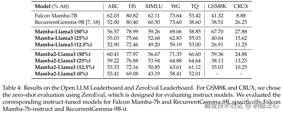 基准评估。表 4 显示经过蒸馏的混合模型的性能与 Open LLM Leaderboard 上最好的开源线性 RNN 模型相匹配,同时在 GSM8K 和 CRUX 中优于相应的开源指令模型。