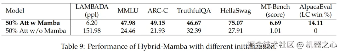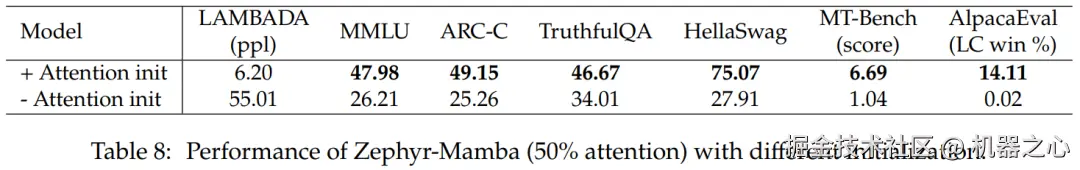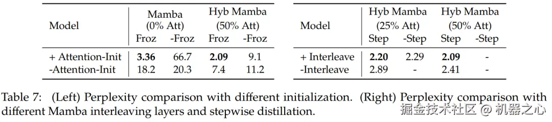 表 7 比较了几种不同模型的消融研究。表 7(左)展示了使用各种初始化的蒸馏结果,表 7(右)显示渐进式蒸馏和将注意层与 Mamba 交错带来的收益较小。