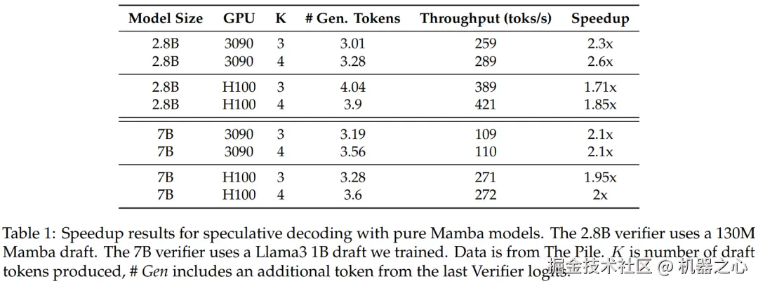 为了验证这种方法的有效性,该研究使用 Mamba 7B 和 Mamba 2.8B 作为目标模型进行推测。结果如表 1 所示。