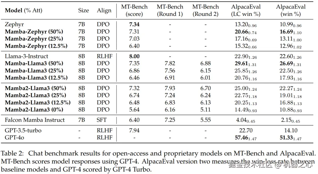 该研究使用两个 LLM 聊天模型进行实验:Zephyr-7B 是在 Mistral 7B 模型的基础上微调而来, 以及 Llama-3 Instruct 8B。对于线性 RNN 模型,该研究使用 Mamba 和 Mamba2 的混合版本,其中注意力层分别为 50%、25%、12.5% 和 0%,并将 0% 称为纯 Mamba 模型。Mamba2 是 Mamba 的一种变体架构,主要针对最近的 GPU 架构而设计。