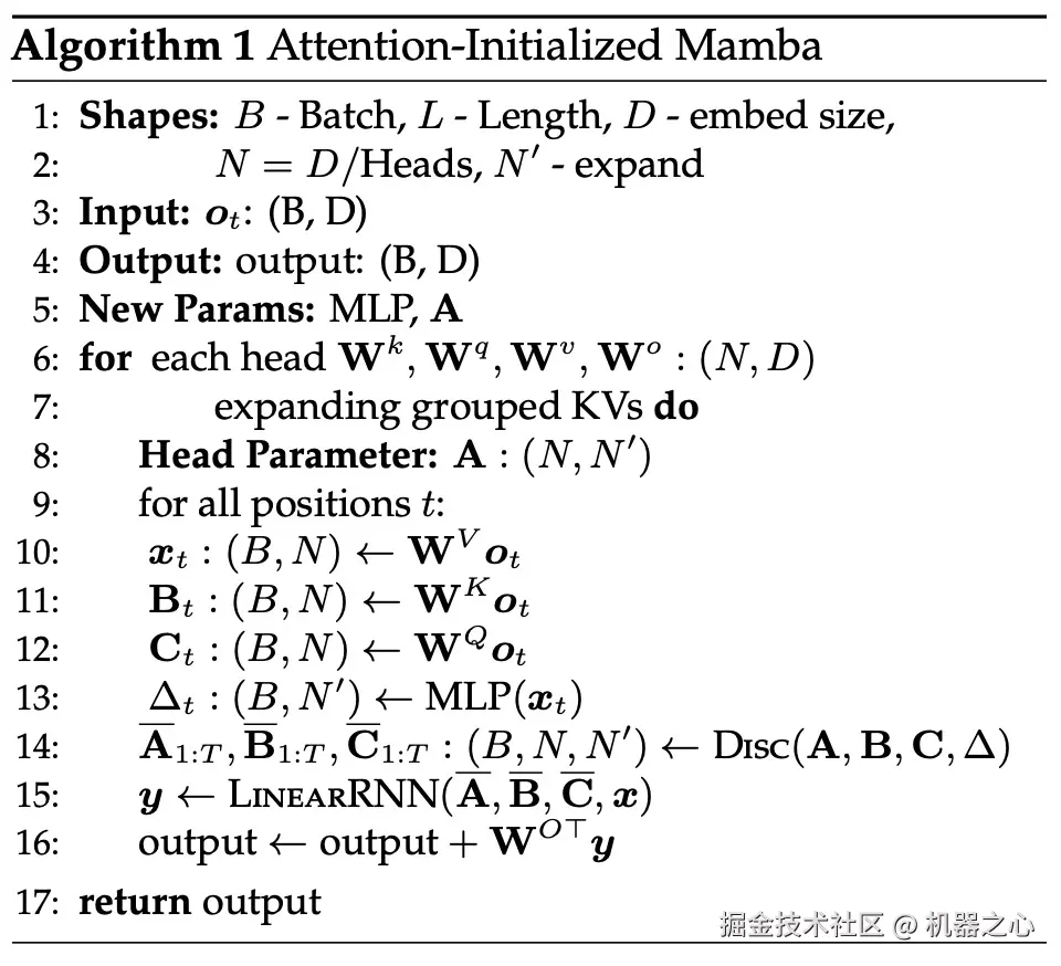 如算法 1 所示,该研究将来自注意力机制的标准 Q、K、V 头直接馈入到 Mamba 离散化中,然后应用得到的线性 RNN。这可以看作是使用线性注意力进行粗略初始化,并允许模型通过扩展的隐藏状态学习更丰富的交互。
