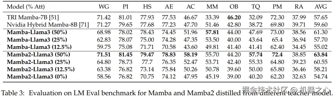 零样本评估。表 3 显示了从不同教师模型中蒸馏出的 Mamba 和 Mamba2 在 LM Eval 基准中的零样本性能。从 Llama-3 Instruct 8B 中蒸馏出的混合 Mamba-Llama3 和 Mamba2-Llama3 模型与从头开始训练的开源 TRI Mamba 和 Nvidia Mamba 模型相比表现更好。