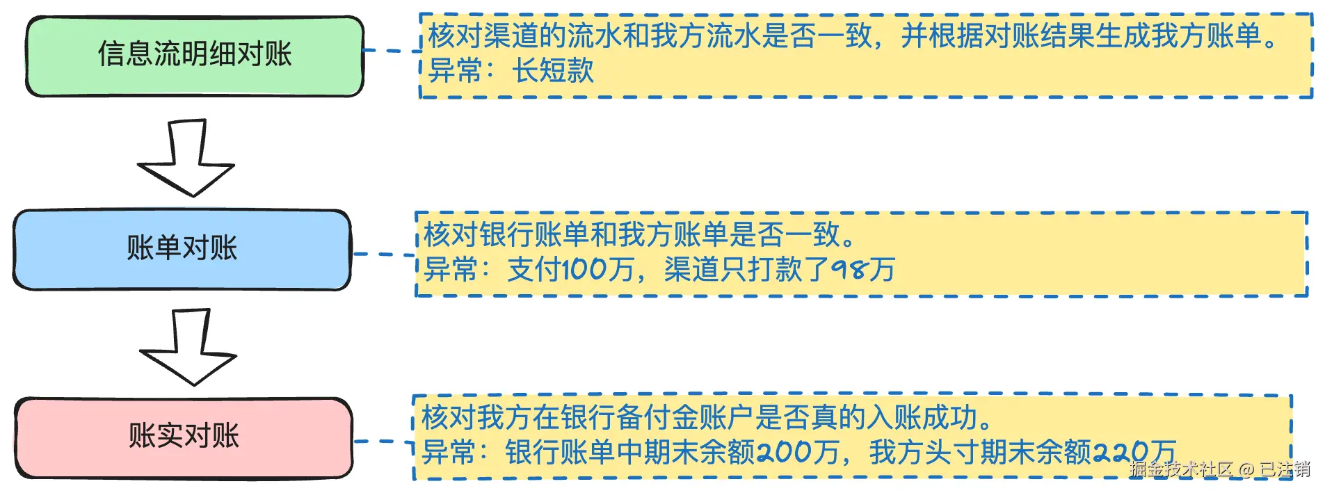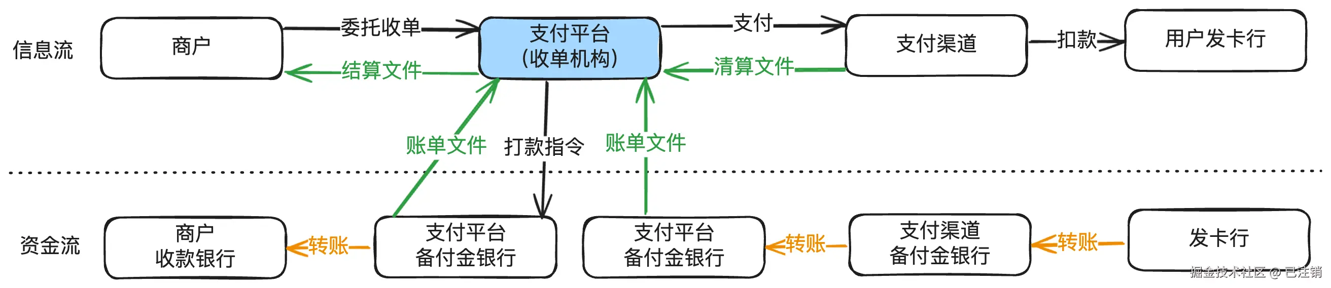 - 银行和支付平台之间是机构对机构的关系,通常使用清算概念,因为金融机构之间大部分情况下会由独立的清算机构完成清算服务。