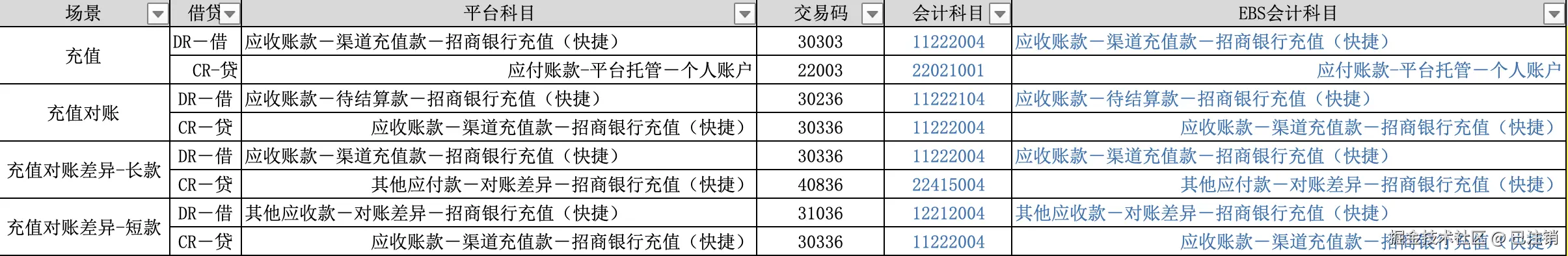 | 借记账户 | 应收-渠道-CMB | 应收归属借记账户 |