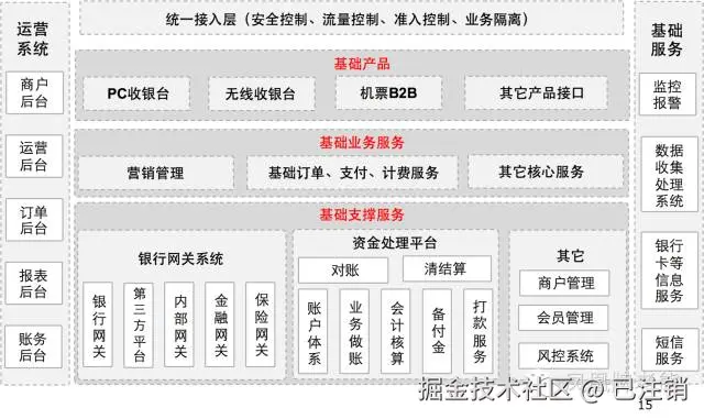 看一下十年前各大互联网公司支付系统架构图,就会发现最基础的偏底层的那部分到现在也很有参考价值,但是性能、可用性、基础架构等已经发生了天翻地覆的变化。比如根据公开资料,2019 年双11 支付宝的支付峰值为54.4 万笔/秒,真实承载能力应该远高于此。创新的业务也发生了极大的变化,比如京东白条的横空出世,在海外旅游可以直接用支付宝或微信扫码付款等。