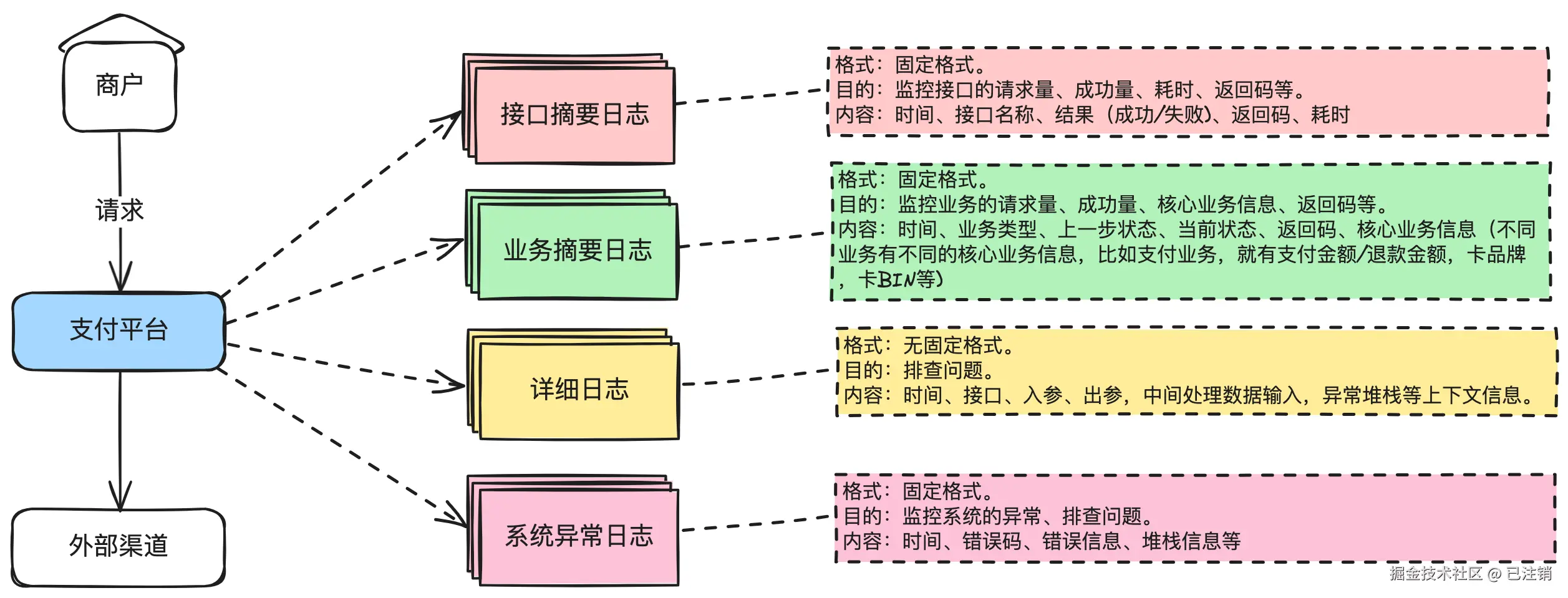 - 业务摘要日志。监控业务的请求量、成功量、核心业务信息、返回码等。使用固定格式,需要打印:时间、业务类型、上一步状态、当前状态、返回码、核心业务信息(不同业务有不同的核心业务信息,比如流入,就有支付金额/退款金额,卡品牌,卡BIN等)。