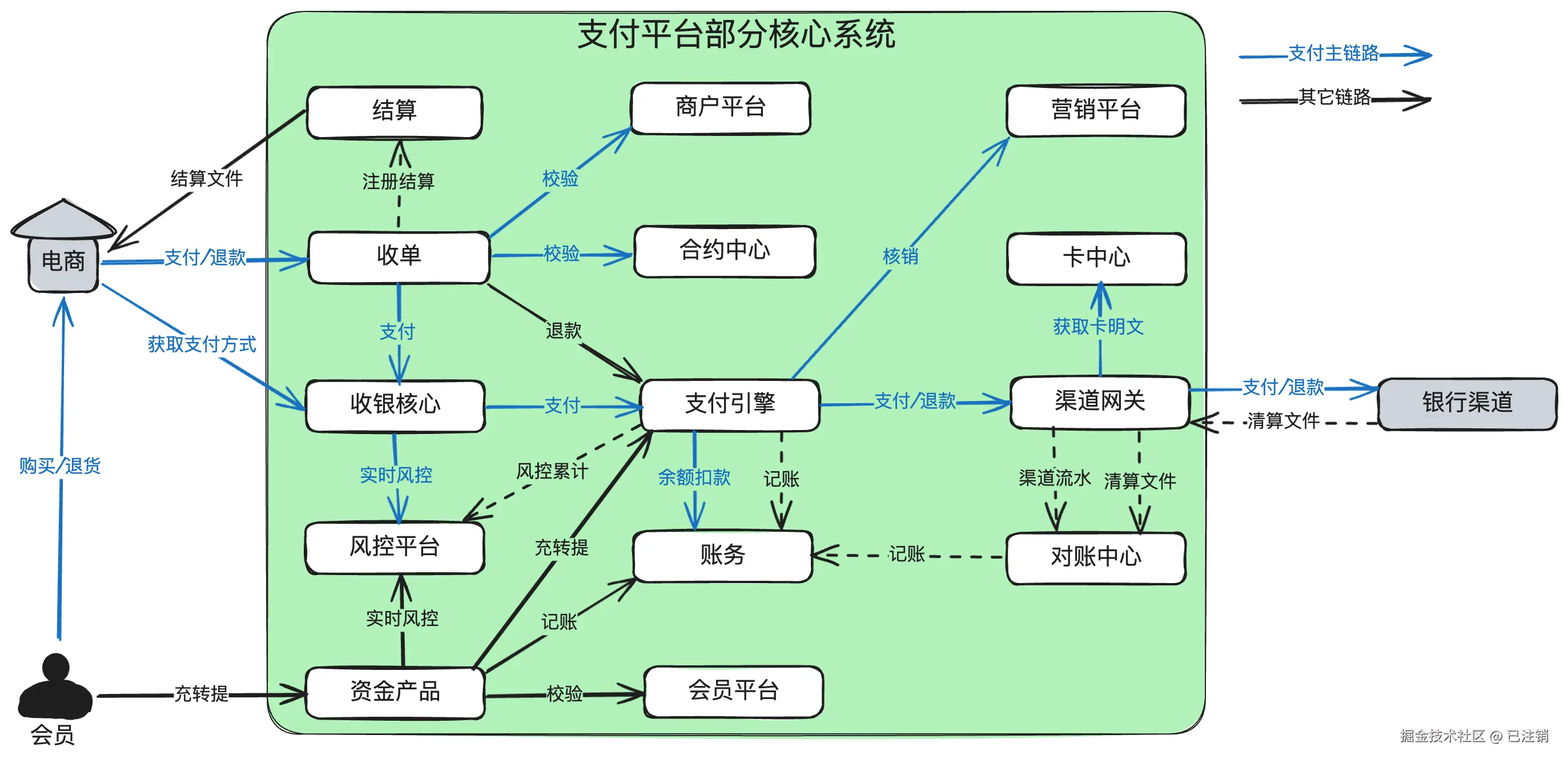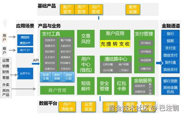 另:后面的描述中,经常混着用“支付系统”、“支付平台”,“支付机构”,“收单机构”,本质是一个东西。在内部来说,就是一个支付系统,但从和外部机构交互来说,就是一个支付平台。对用户来说是支付,对商户来说就是帮商户收单。