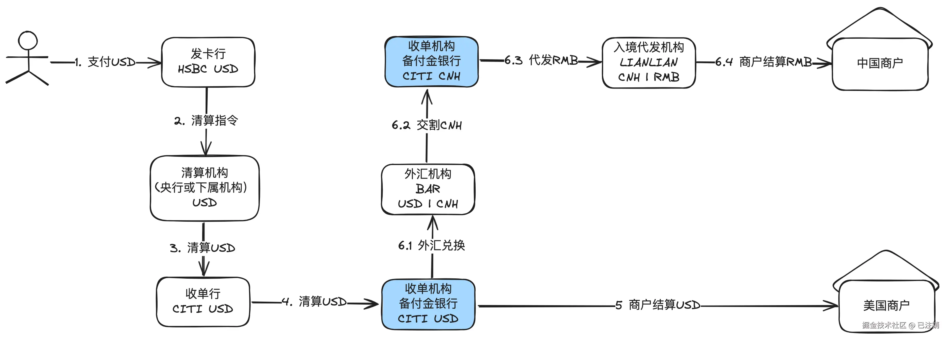 - 这是一个典型的跨境资金流案例。用户支付USD,收单机构收到的是USD,但是需要结算CNY给中国境内的商户。