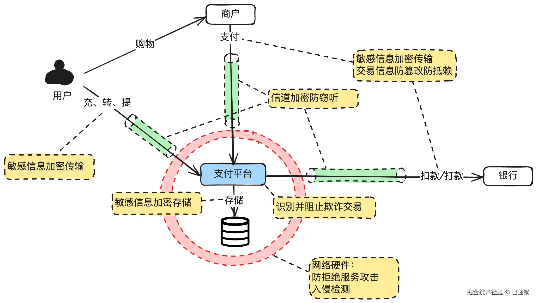 下图是一个极简版的支付安全大图,包含了支付安全需要考虑的核心要点。