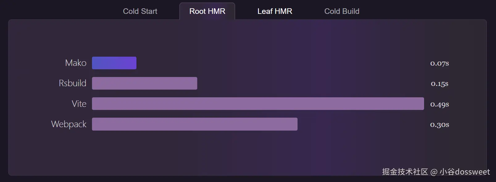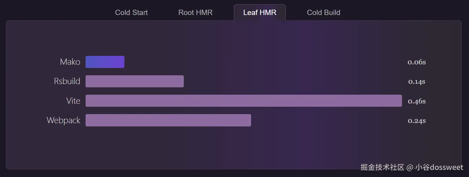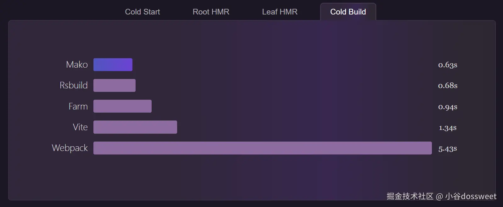从官网的性能对比报告来看,相比于其他的前端构建工具,Mako 在 冷启动、热更新、冷构建 都有较好的表现: