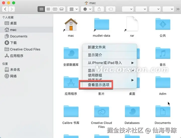 首先,将这部分内容从隐藏显示在「访达」中。在「访达」中打开当前用户文件夹,在右击菜单中选中「查看显示选项」然后勾选显示“资源库”文件夹。