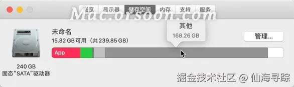 注意:系统会将存储空间根据不同文件类别所占的空间大小显示在条状图上,大部分类型看文字都比较好理解,但对于 “其他” (系统升级到 Monterey 后更名为 “系统数据” )