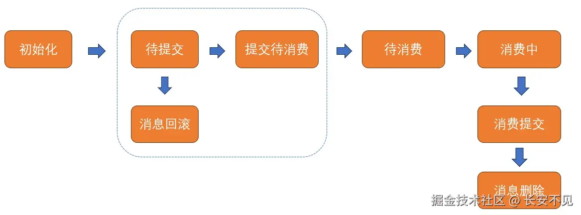 事务消息的生命周期相对于普通消息的生命周期多了一个事务周期,也就是待提交、回滚: