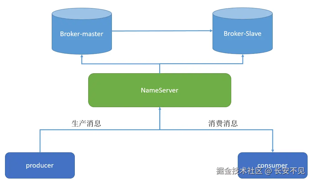 消息队列表达的另一种语义是生产者消费者模型,也就是说在消息队列里面一般都会有生产者和消费者,从名字上就可以推断出来,生产者负责生产消息,消费者负责消费消息,还有一个存储消息的地方,在RocketMQ里面这个存储消息的地方叫Broker,那么问题来了, 这三个是如何联系起来的呢? 答案是NameServer: