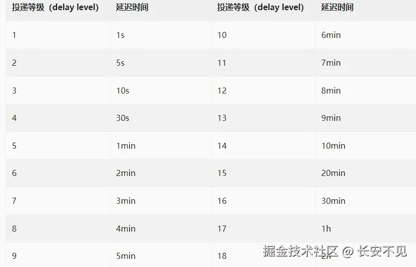 所谓延时消息也就是消息在到达RocketMQ之后,等待一段时间才能被消费者消费的消息,相当朴实无华,一个典型的场景就是订单下单之后未支付,在一定时间内关闭订单,我们就可以使用延迟消息来处理对应的场景,RocketMQ的场景的使用建议是避免大量相同定时时刻的消息,定时消息的实现逻辑需要先经过定时存储等待触发,定时时间到达后才会被投递给消费者。因此,如果将大量定时消息的定时时间设置为同一时刻,则到达该时刻后会有大量消息同时需要被处理,会造成系统压力过大,导致消息分发延迟,影响定时精度。RocketMQ 在5.0 之后支持任意精度的延迟消息,在5.0之前只支持18个等级的延迟投递: