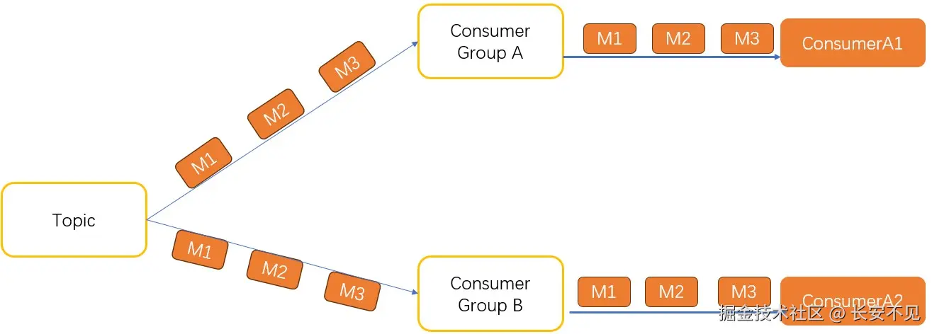 在RocketMQ的领域模型中,同一个消息支持被多个消费者分组订阅,,每个消费者可消费到消费者分组内所有的消息,各消费者分组都订阅相同的消息,这在RocketMQ中被称为广播。