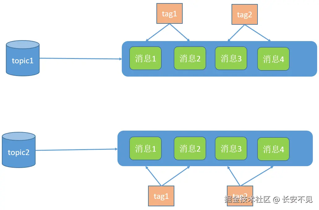 topic容纳的是一种类型的信息,我们可以将其看做是一个分类标准,但有时候一个大分类还不够,我们需要对信息进一步分类,RocketMQ在主题的基础上为我们提供了tag,我们可以将Topic当做一级分类,Tag当做二级分类。