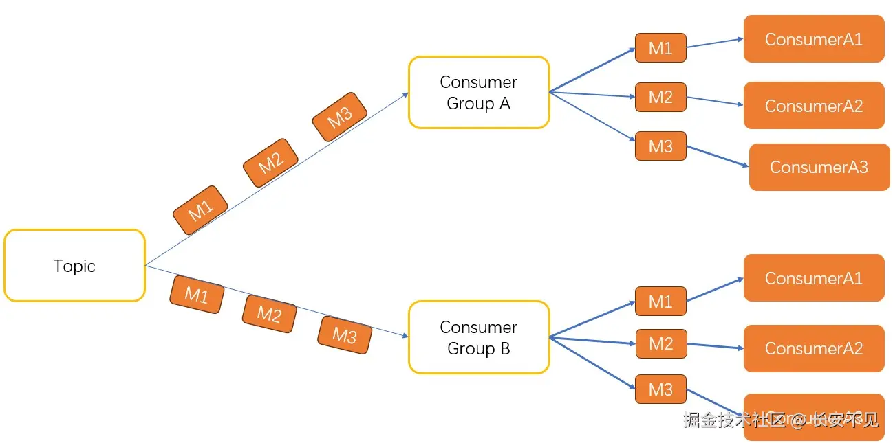 同时,对于每个消费者分组可以初始化多个消费者,这些消费者共同分担消费者分组内的所有消息,实现消费者分组内流量的水平拆分和均衡负载。