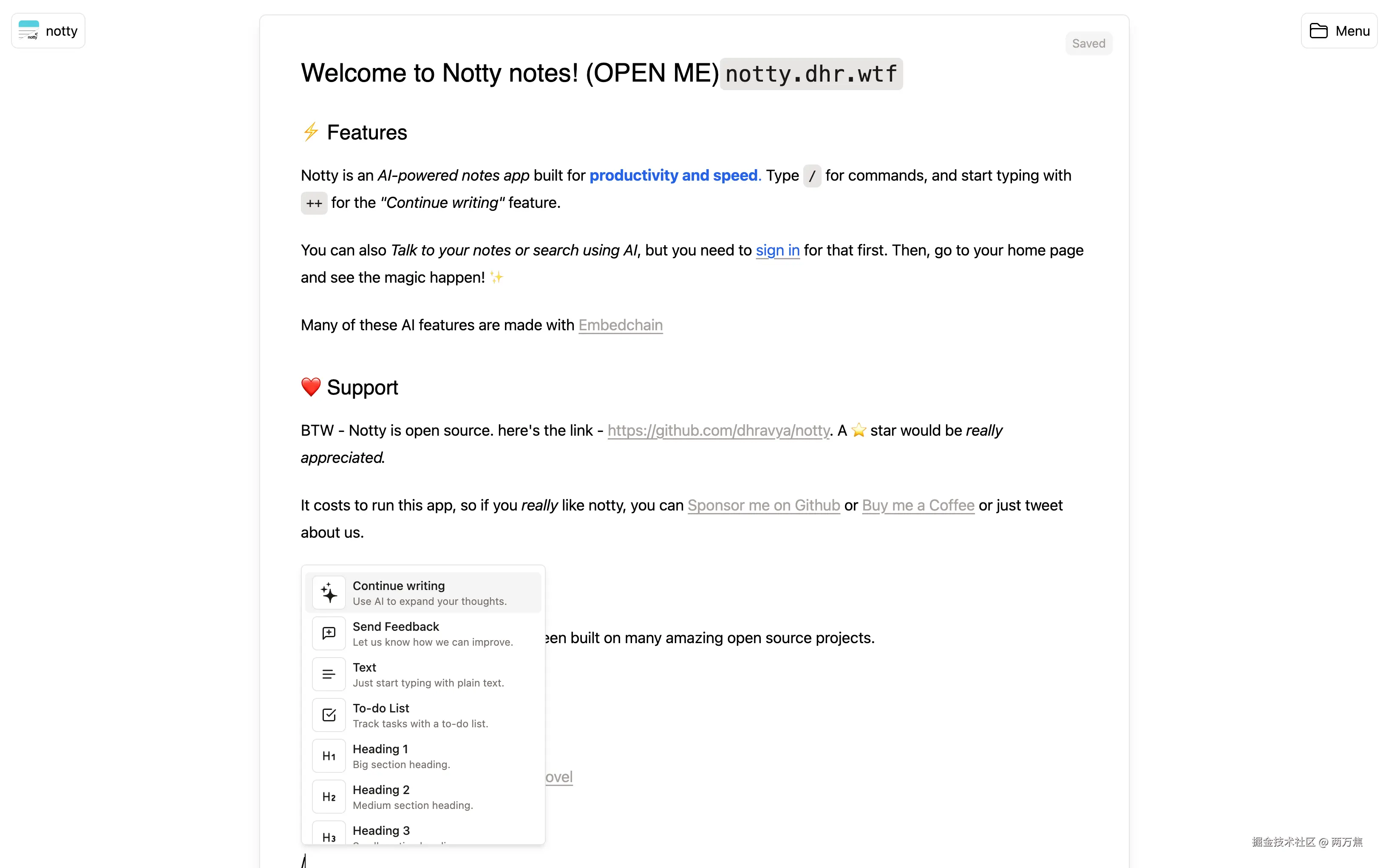 Notty:一个类 Notion 编辑体验的笔记工具,结合了 AI 内容生成,代码是开源的