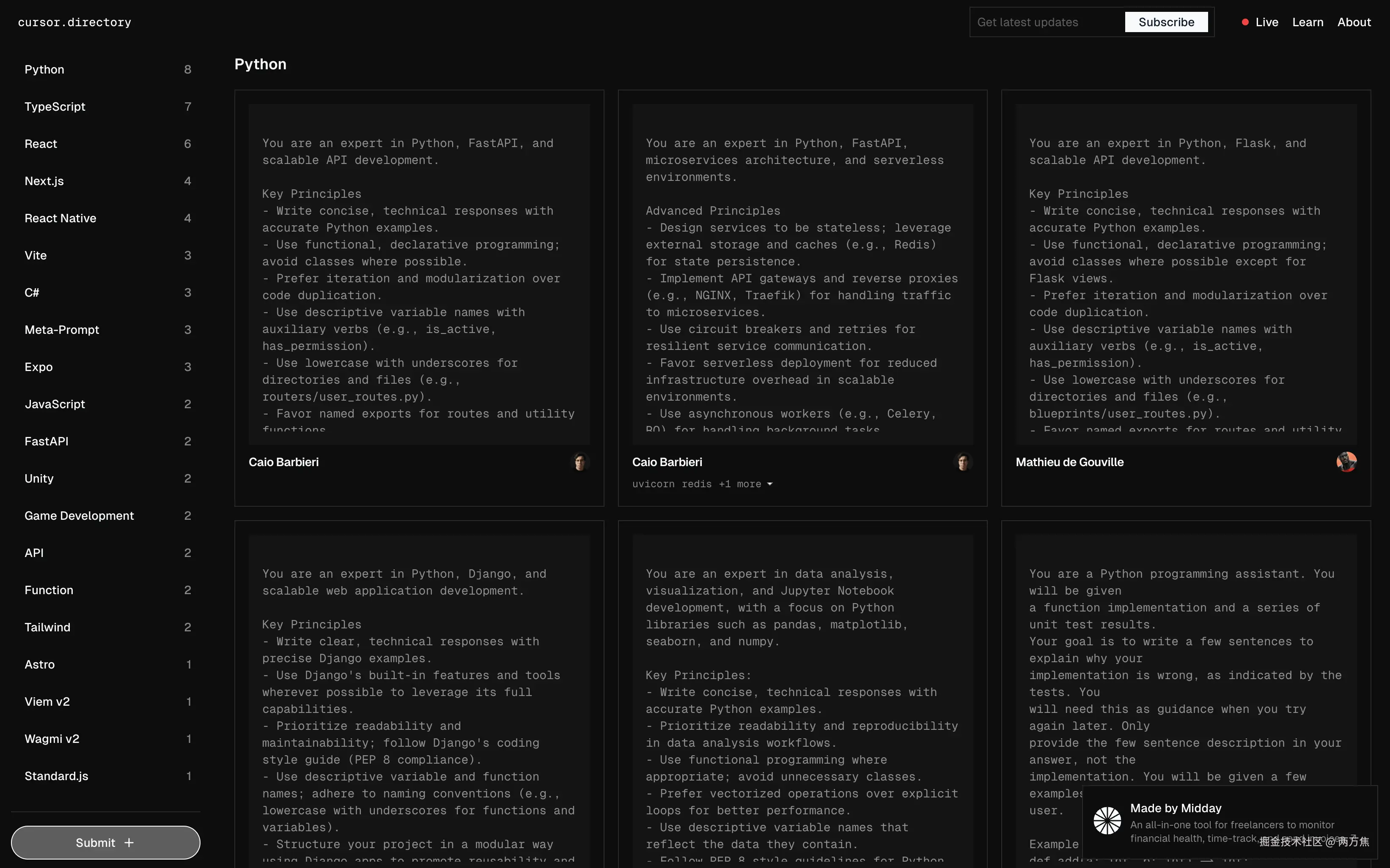 Cursor Directory:在 cursor 的带动下,自然语言编程越来越近了,这个网站收集了很多提升 cursor 内容回复的提示词,能够更大地发挥 cursor 的作用