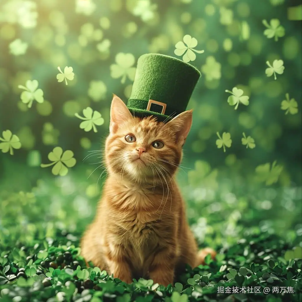 prompt: In this enchanting scene, a charming ginger cat dons a vibrant green top hat adorned with a traditional buckle, perfectly embodying the spirit of St. Patrick's Day. The small feline sits amidst a lush carpet of vivid green shamrocks, which add a magical and whimsical touch to the composition. The soft, diffused light filters through the scene, highlighting the cat's thoughtful expression and the playful spark in its eyes. This image captures a delightful blend of festivity and serenity, evoking feelings of joy and good luck.