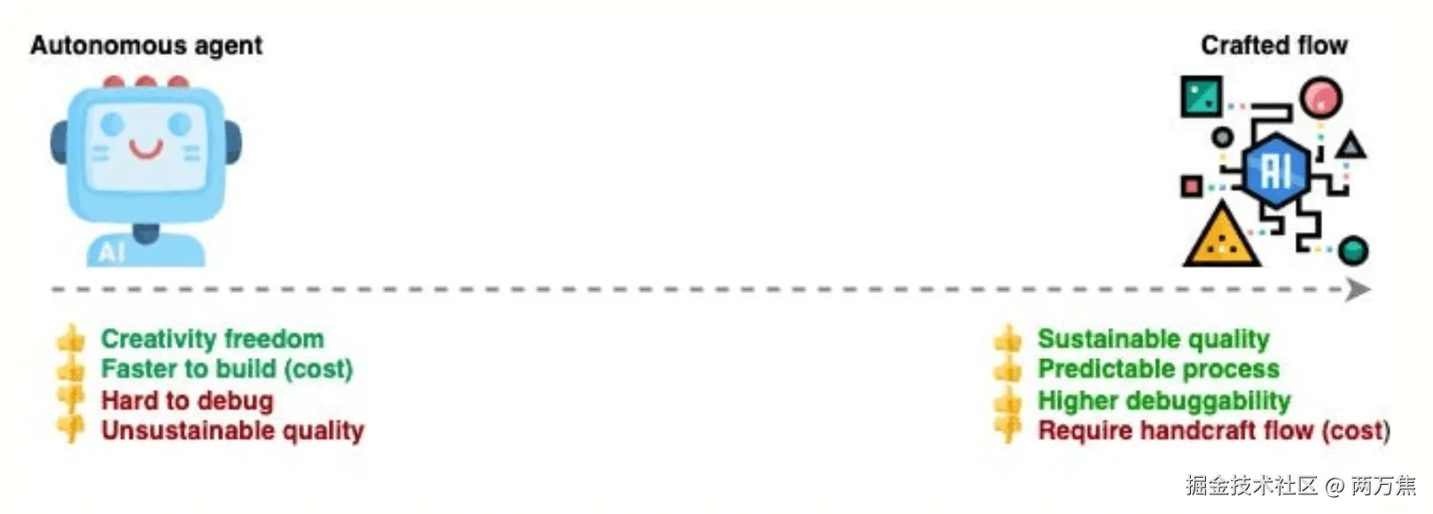 - 自主代理是大模型自己思考什么时候需要使用工具,优点是简单、能够快速实现,但缺点是无法保证输出质量、很难调试