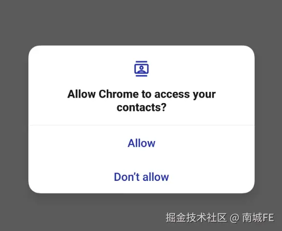手机会在每次使用联系人选择器API代码时显示这个弹出窗口,直到用户点击“允许”。联系人选择器API在未允许之前不会运行。这个一次性的,授权之后不会再弹出。