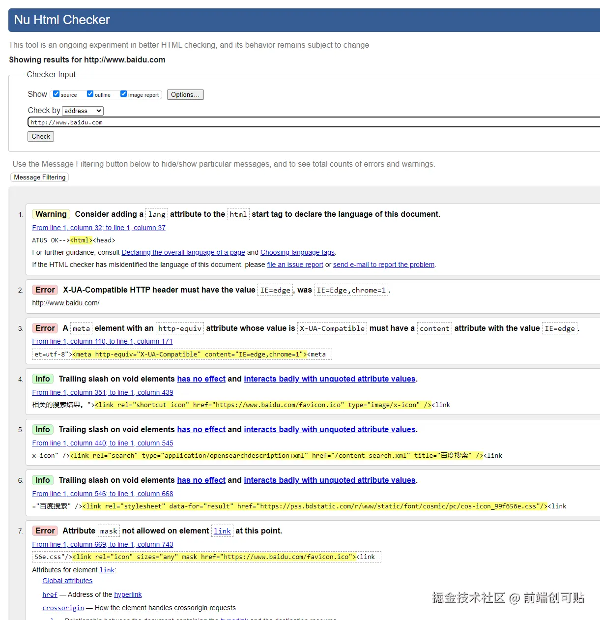 我们在编写 HTML 代码的时候,有时可能因为粗心大意,导致一些不规范或者错误的代码出现,但是又很难被我们发现,这个时候就可以借助工具来帮我们检查。Nu Html Checker 工具,在输入我们的网站地址后,就可以帮助我们检查分析 HTML 的错误,提升我们的错误排查效率和网站质量。