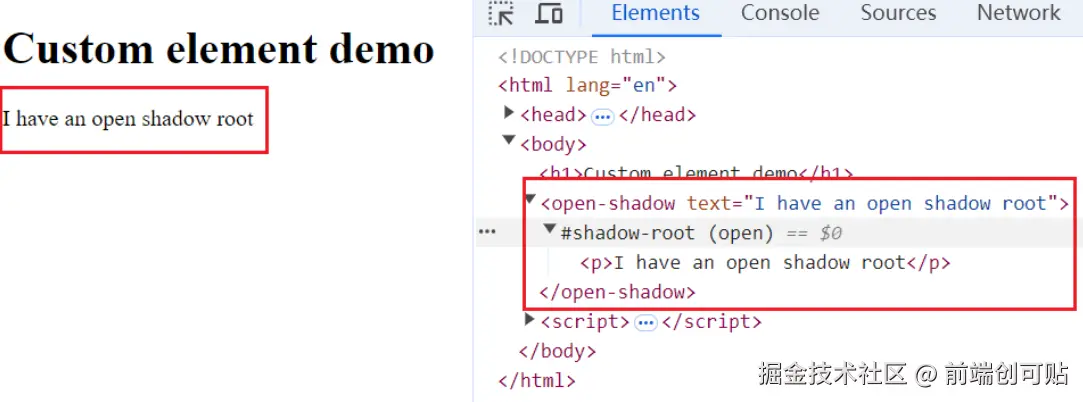 <open-shadow text="I have an open shadow root"></open-shadow>