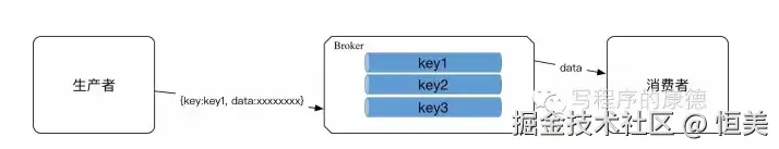 kafka、JMS就属于这个流派,生产者会发送key和数据到Broker,由Broker比较key之后决定给那个消费者。这种模式是我们最常见的模式,是我们对MQ最多的印象。在这种模式下一个topic往往是一个比较大的概念,甚至一个系统中就可能只有一个topic,topic某种意义上就是queue,生产者发送key相当于说:“hi,把数据放到