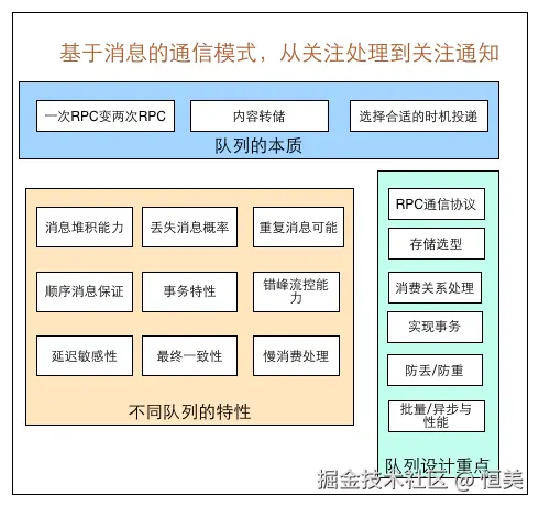 总而言之,消息队列不是万能的。对于需要强事务保证而且延迟敏感的,RPC是优于消息队列的。 对于一些无关痛痒,或者对于别人非常重要但是对于自己不是那么关心的事情,可以利用消息队列去做。 支持最终一致性的消息队列,能够用来处理延迟不那么敏感的“分布式事务”场景,而且相对于笨重的分布式事务,可能是更优的处理方式。 当上下游系统处理能力存在差距的时候,利用消息队列做一个通用的“漏斗”。在下游有能力处理的时候,再进行分发。