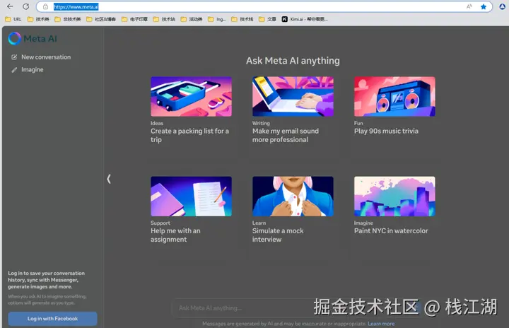 最近meta也推出的名为Meta AI的免费聊天网站。这个网站基于Llama 3大语言模型,支持包括美国在内的13个国家和地区访问使用,用户可以通过浏览器免费试用。
