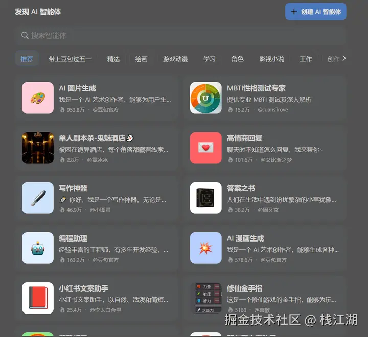 还有大量的插件功能,你也可以创建自己的AI智能体。在字节的其它平台也有类似的功能比如AI bot都是创建自己的AI机器人然后可以发布到平台给自己或其他人使用。